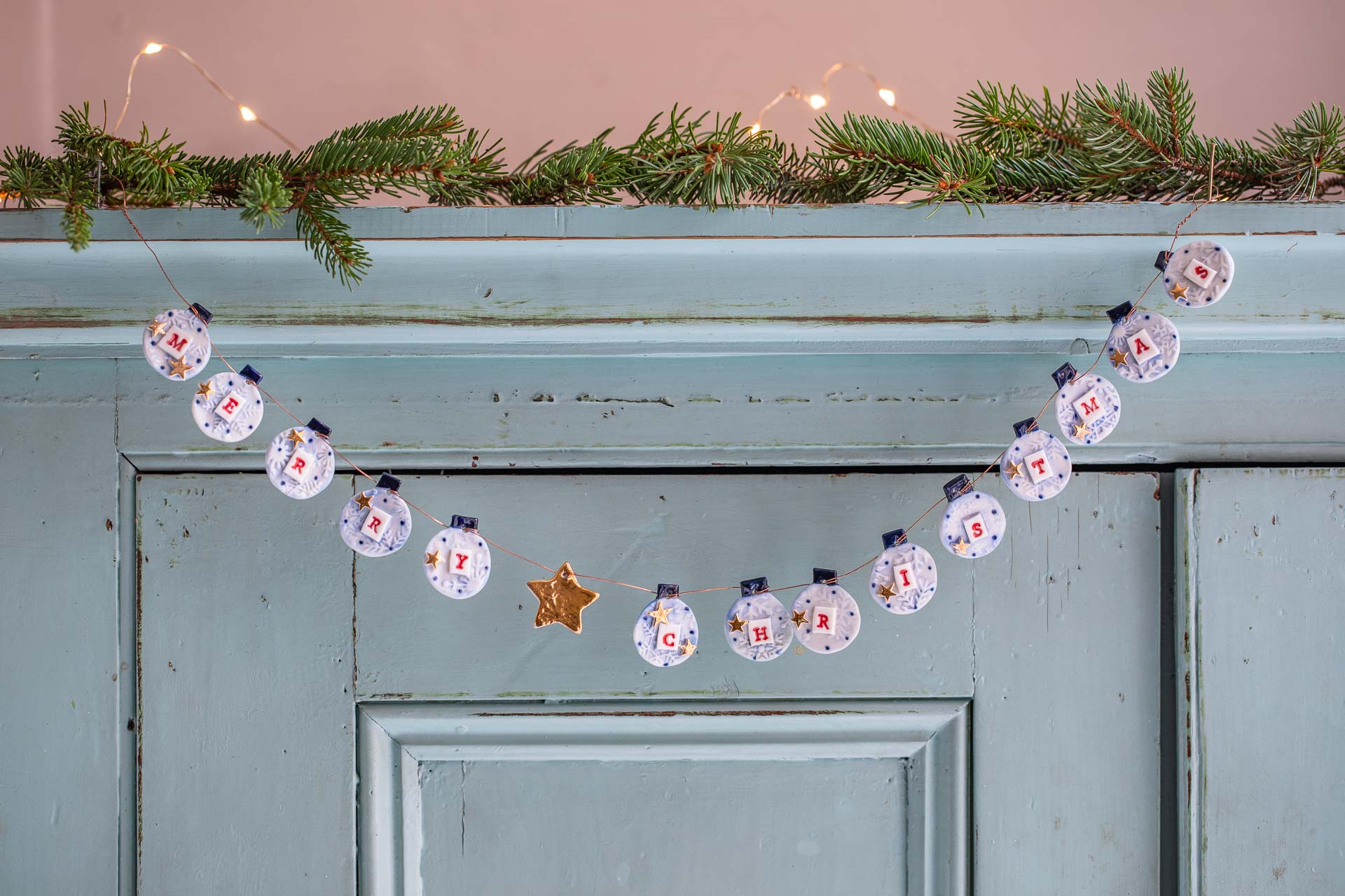 These garlands are entirely hand-made and strung onto copper wire and the teeny shapes spell out merry or happy Christmas.