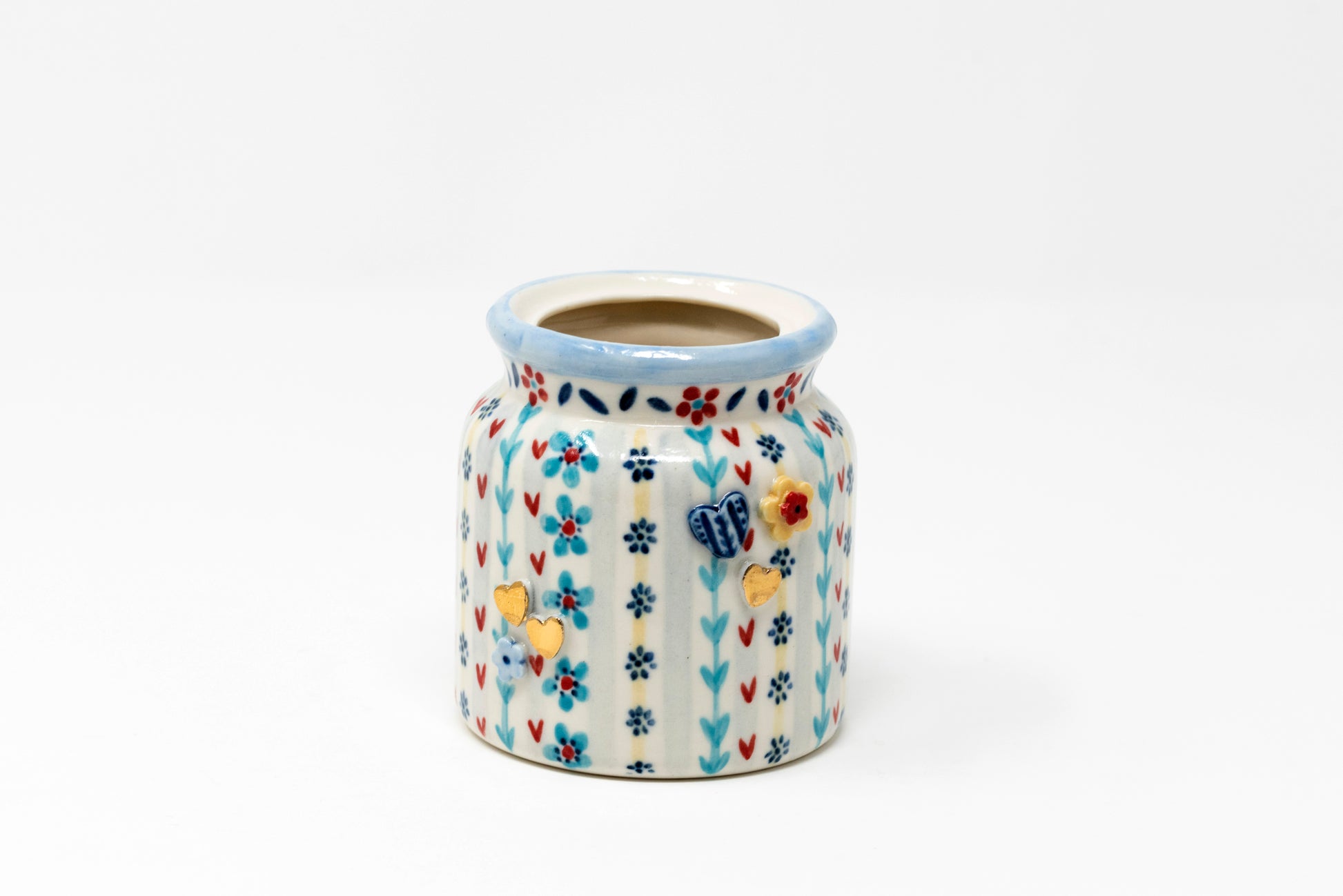Beautiful unique hand-painted porcelain jars with floral details and 3D elements. They are glazed inside and make the perfect vase or storage pot.